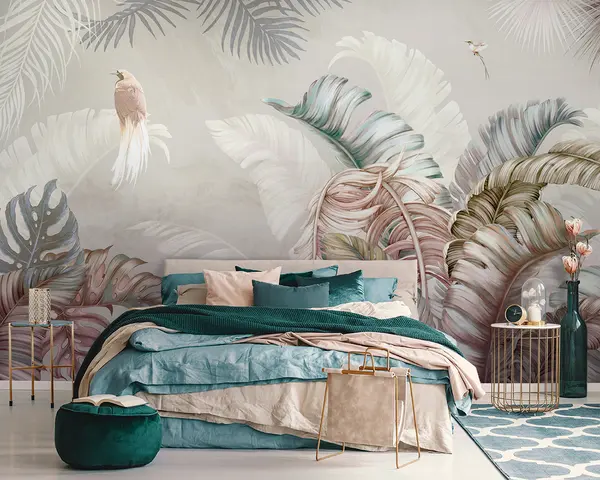 Stenske poslikave Tropska ilustracija s palmovimi listi banan in pticami Št. u96254
