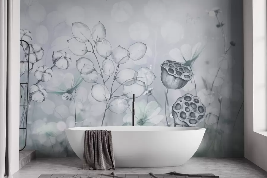 Sanjski cvetlični vrt, metulj, bombažni cvetovi, lotosi, sive barve