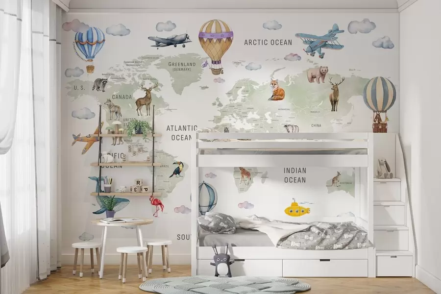 Otroški zemljevid sveta z živalmi in znamenitostmi