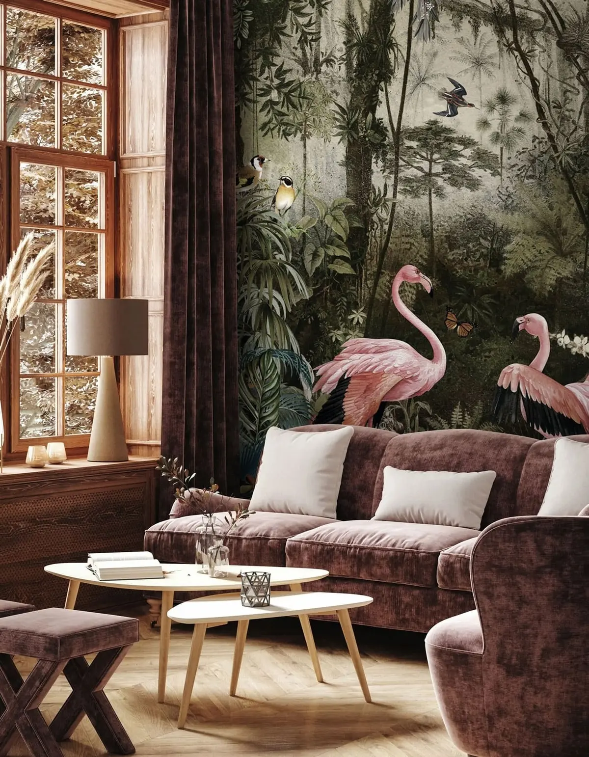Stenske poslikave Tropske ptice in flamingi v džungli Št. u73568
