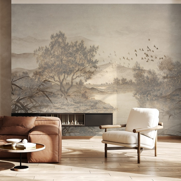 Pokrajina z jezerom, vodnimi lilijami in lilijevimi listi, drevesi v ozadju, v mirnem okolju, svetlo modrih in zelenih tonih