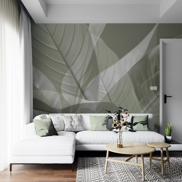 Tropski listi v umirjenih sivih in rjavih tonih, ki poudarjajo teksturo in subtilne prehode med svetlobo in senco