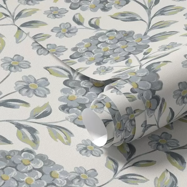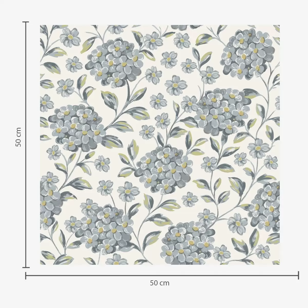 Tapeta Goste cvetove in liste v sivo-modri barvni paleti Št. a00778
