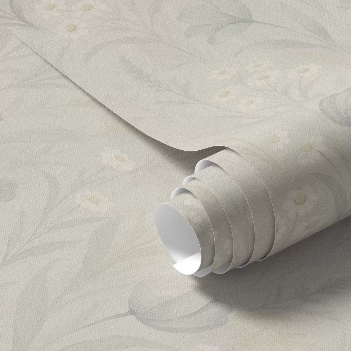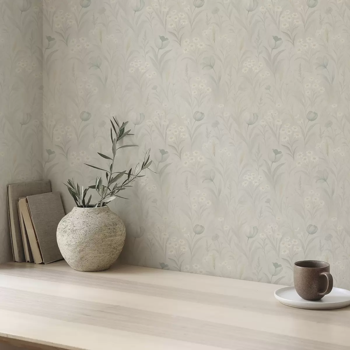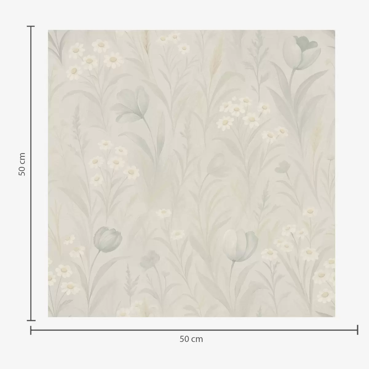 Tapeta Nežna travnik s tulipani in marjeticami, pastelno sivka Št. a00779