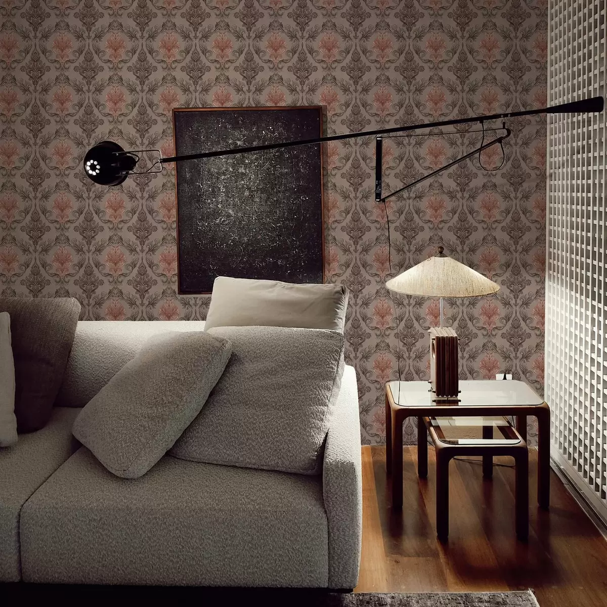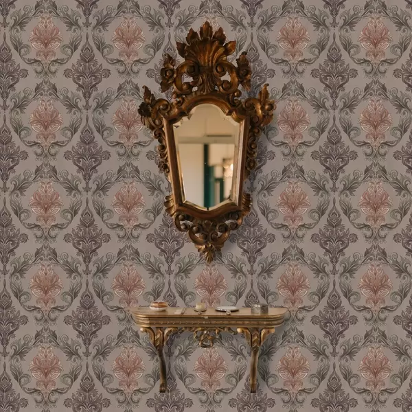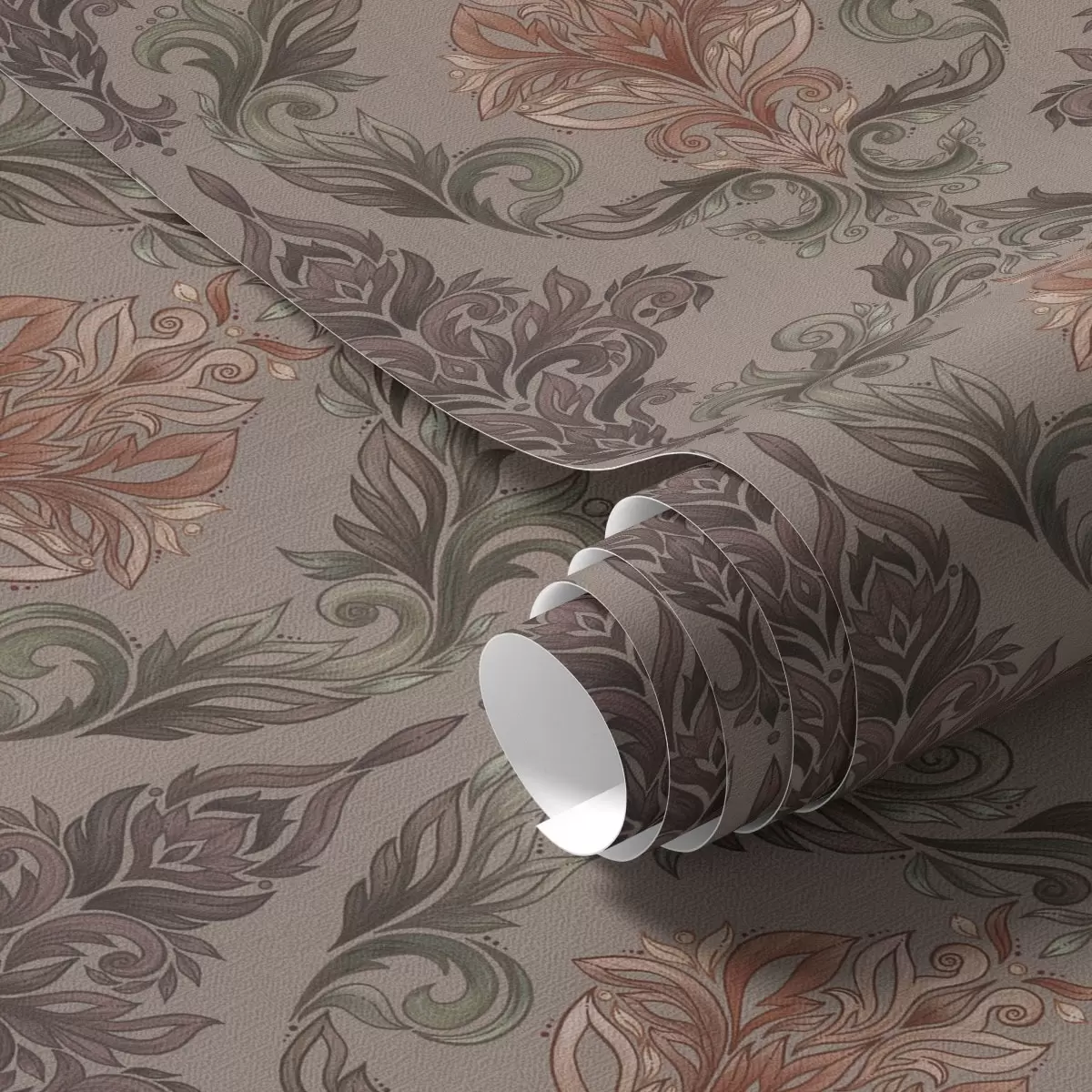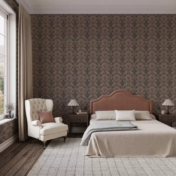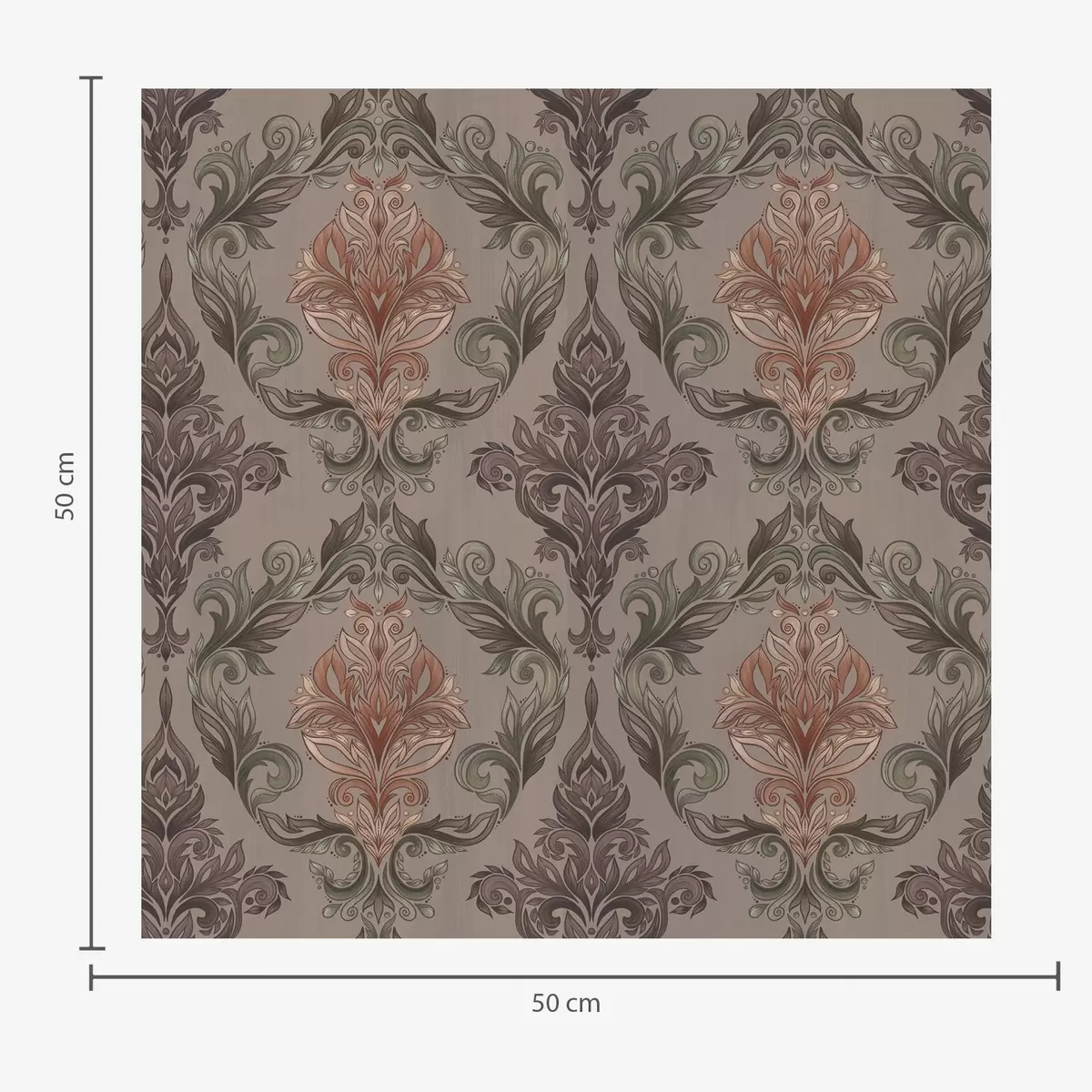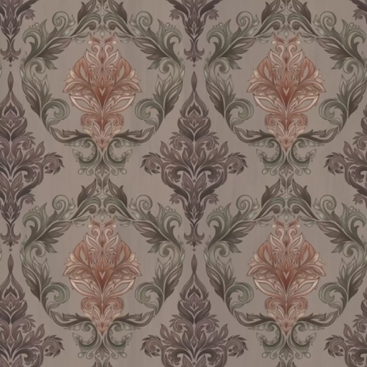 Stenske poslikave Damask v rjavi-terakotni barvni paleti, toplo sivo ozadje Št. a00828v2