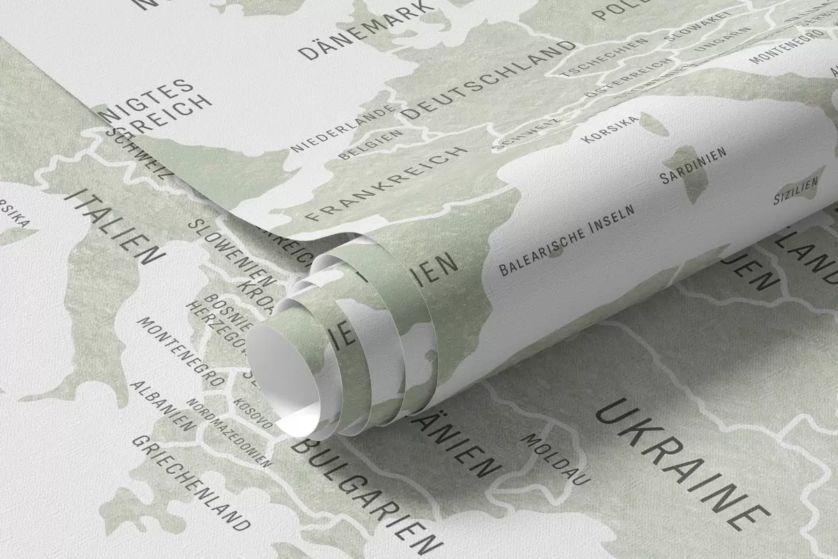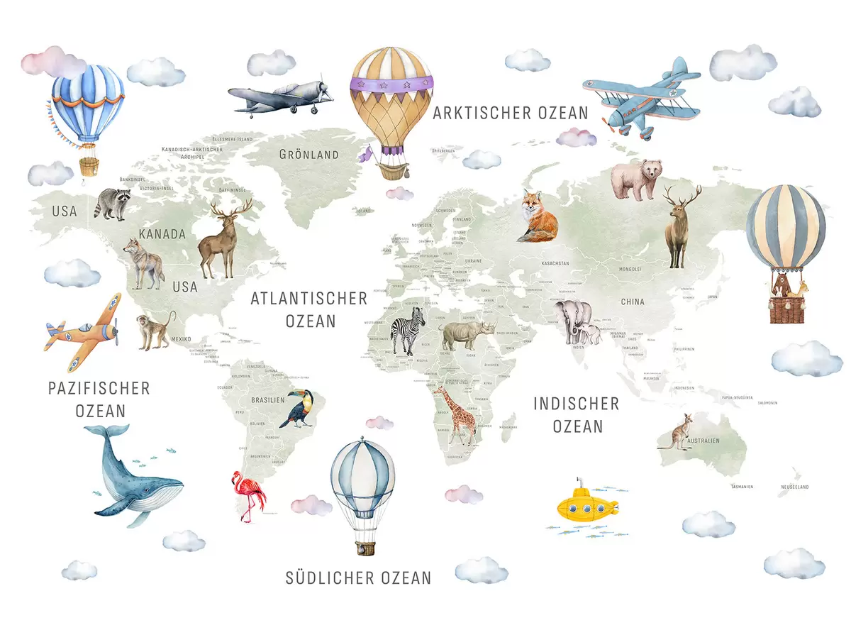 Stenske poslikave Otroška zemljevid v akvarelnem slogu z živalmi in toplozračnimi baloni. Nemški jezik. Zelena barva. Št. c00001de