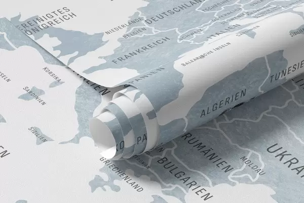 Stenske poslikave Otroška zemljevid v akvarelnem slogu z živalmi in toplozračnimi baloni. Nemški jezik. Modra barva. Št. c00001dev1