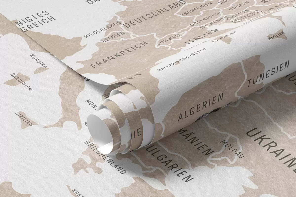 Stenske poslikave Otroška zemljevid v akvarelnem slogu z živalmi in toplozračnimi baloni. Nemški jezik. Bež barva. Št. c00001dev2
