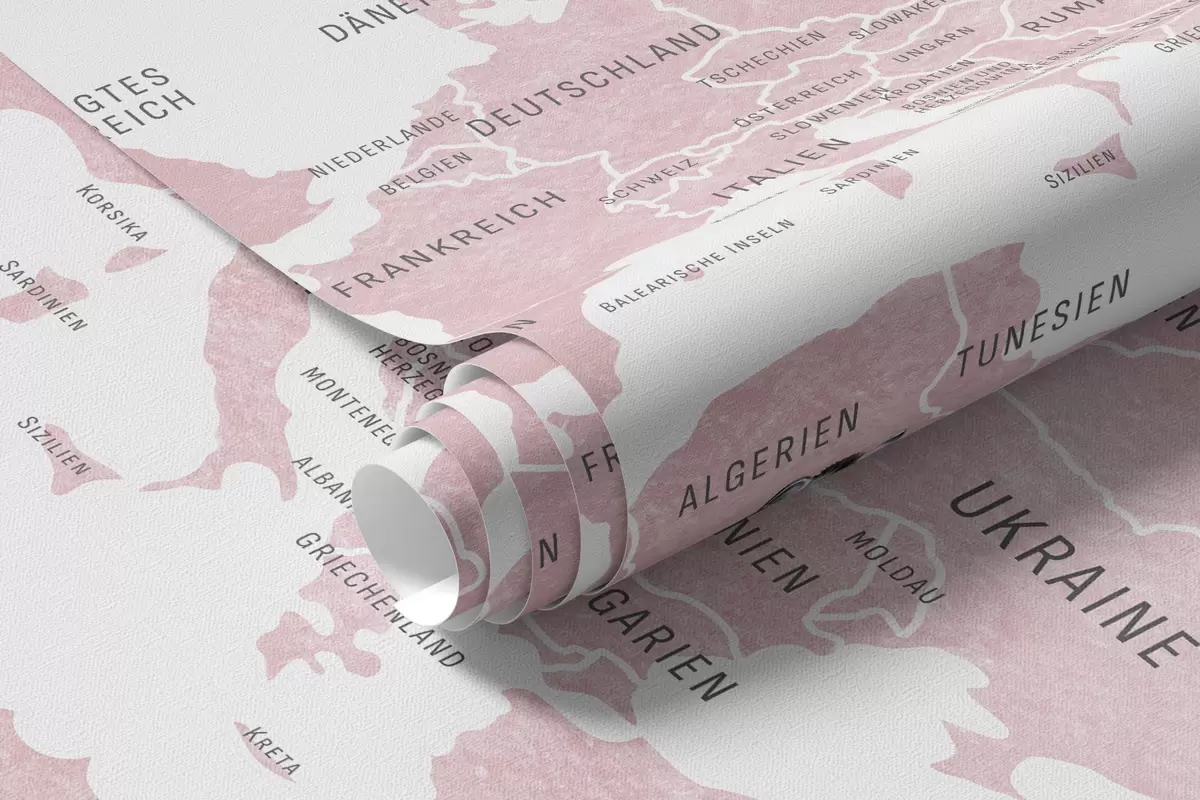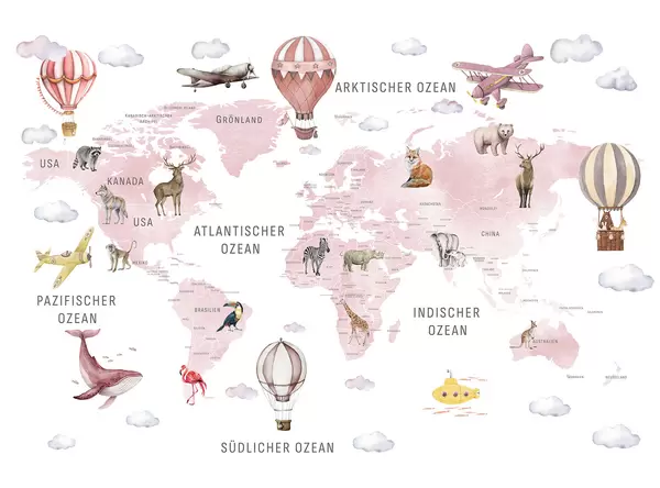 Stenske poslikave Otroška zemljevid v akvarelnem slogu z živalmi in toplozračnimi baloni. Nemški jezik. Roza barva. Št. c00001dev3