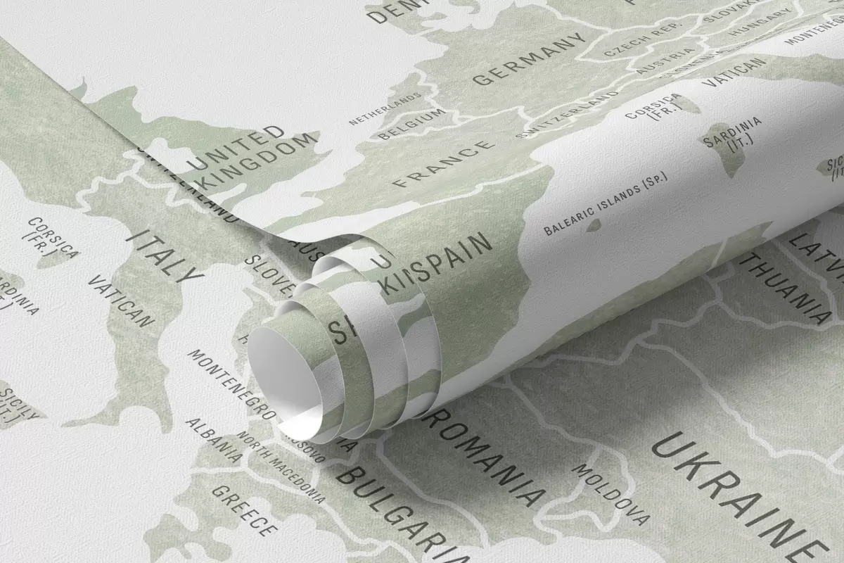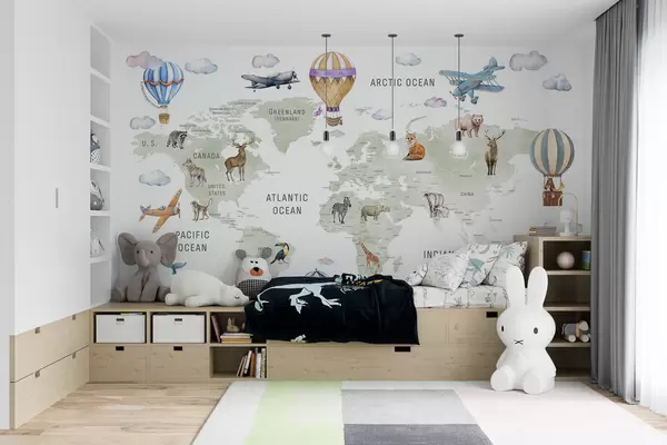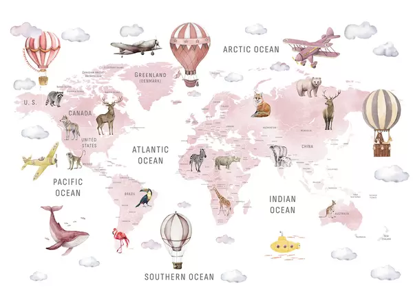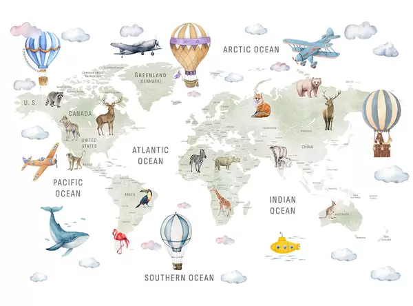 Stenske poslikave Otroška zemljevid v akvarelnem slogu z živalmi in toplozračnimi baloni. Angleški jezik. Zelena barva. Št. c00001en