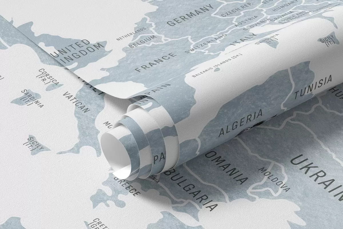 Stenske poslikave Otroška zemljevid v akvarelnem slogu z živalmi in toplozračnimi baloni. Angleški jezik. Modra barva. Št. c00001env1
