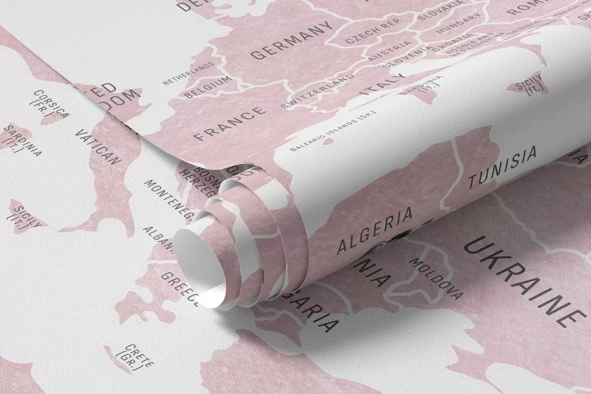 Stenske poslikave Otroška zemljevid v akvarelnem slogu z živalmi in toplozračnimi baloni. Angleški jezik. Roza barva. Št. c00001env3