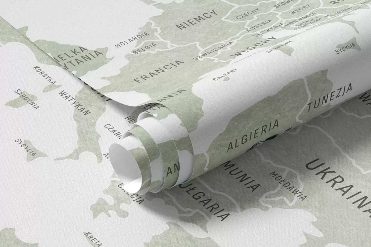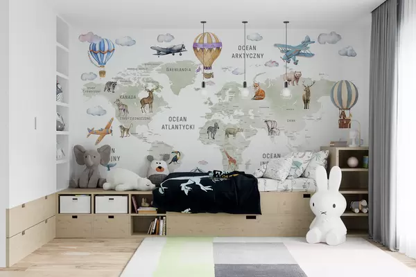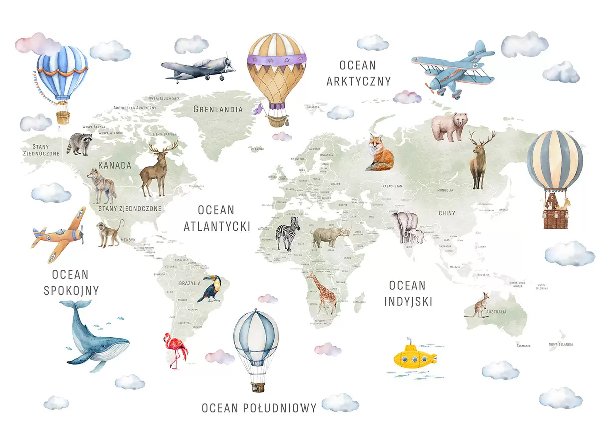Stenske poslikave Otroška zemljevid v akvarelnem slogu z živalmi in toplozračnimi baloni. Poljski jezik. Zelena barva. Št. c00001pl