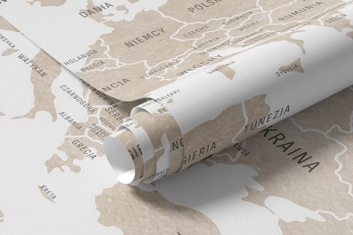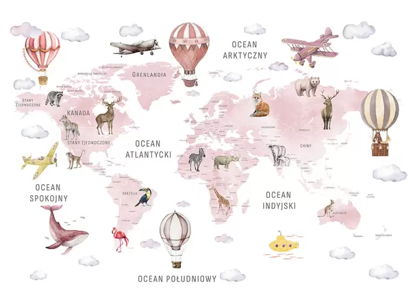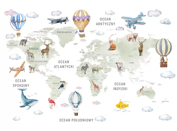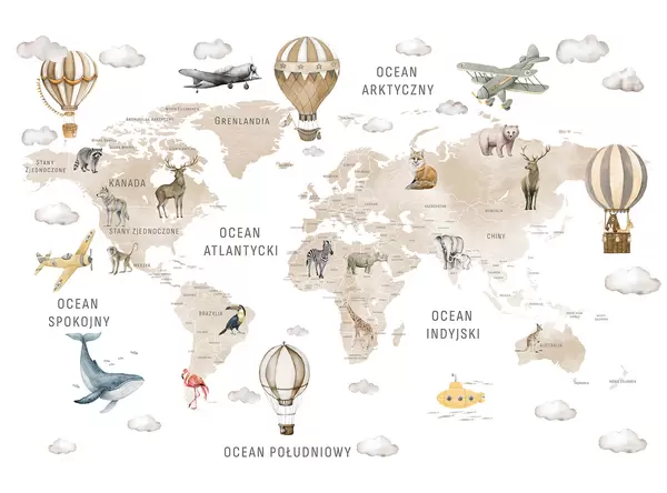 Stenske poslikave Otroška zemljevid v akvarelnem slogu z živalmi in toplozračnimi baloni. Poljski jezik. Bež barva. Št. c00001plv2