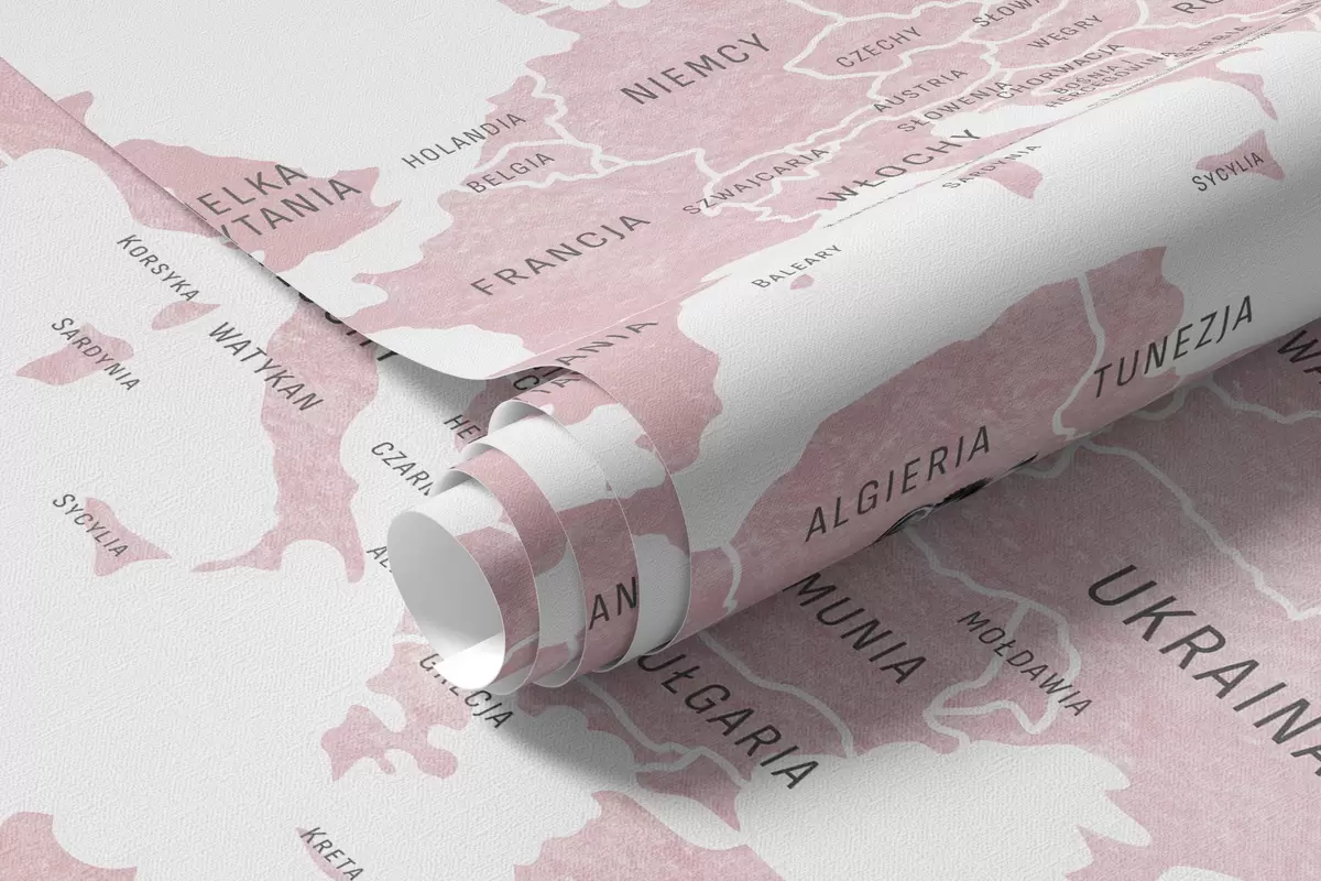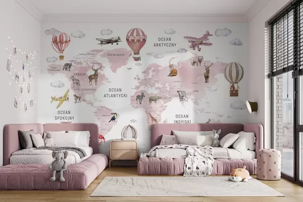 Stenske poslikave Otroška zemljevid v akvarelnem slogu z živalmi in toplozračnimi baloni. Poljski jezik. Roza barva. Št. c00001plv3
