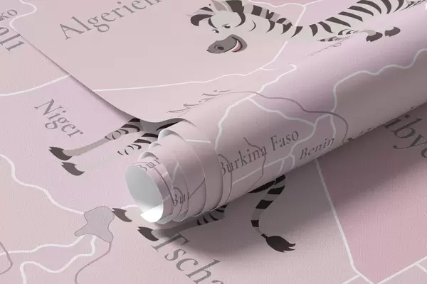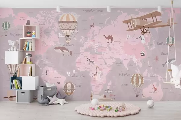 Stenske poslikave Otroški zemljevid sveta z živalmi, letali in toplozračnimi baloni. Nemški jezik. Roza barva. Št. c00003dev3
