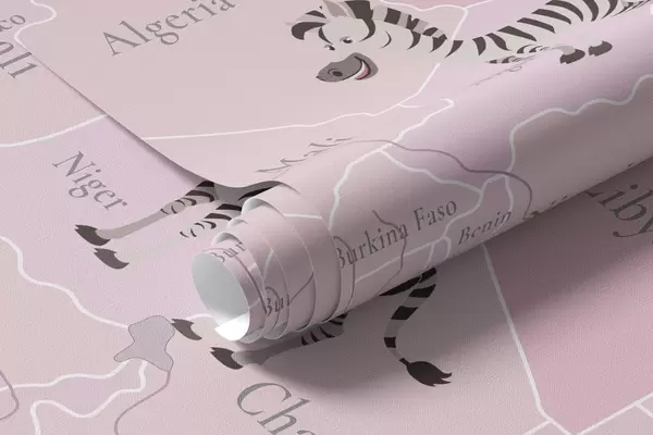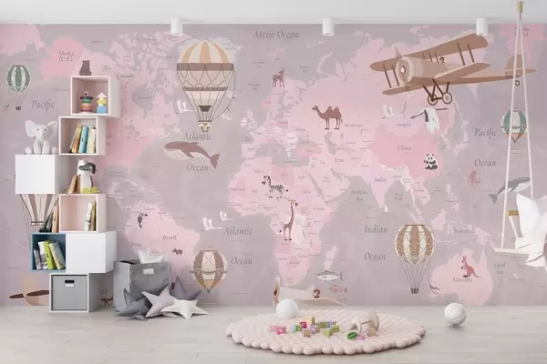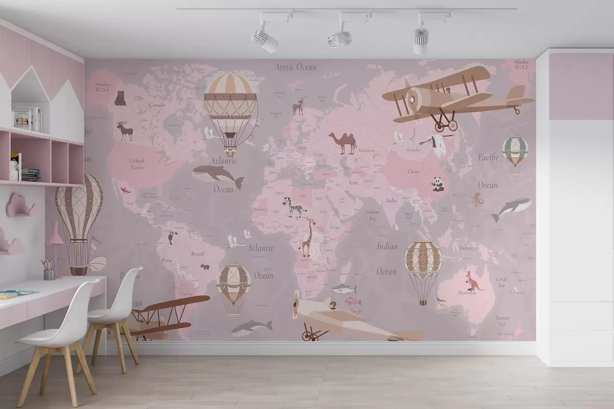 Stenske poslikave Otroški zemljevid sveta z živalmi, letali in toplozračnimi baloni. Angleški jezik. Roza barva. Št. c00003env3