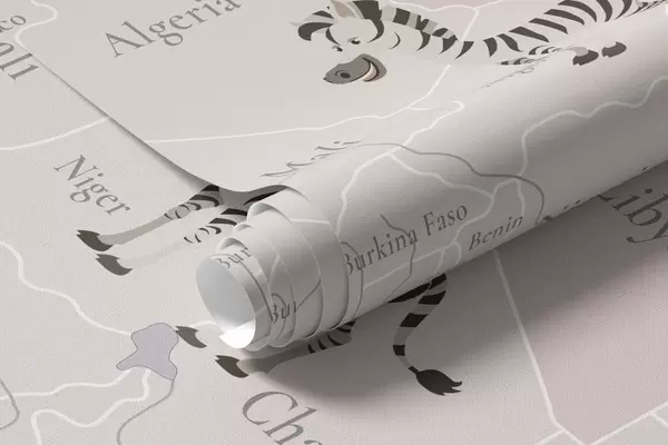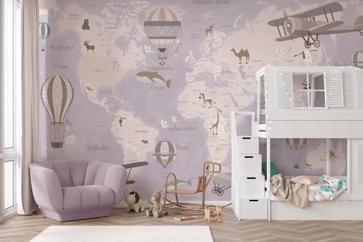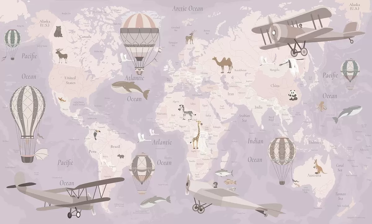 Stenske poslikave Otroški zemljevid sveta z živalmi, letali in toplozračnimi baloni. Angleški jezik. Vijolična barva. Št. c00003env4
