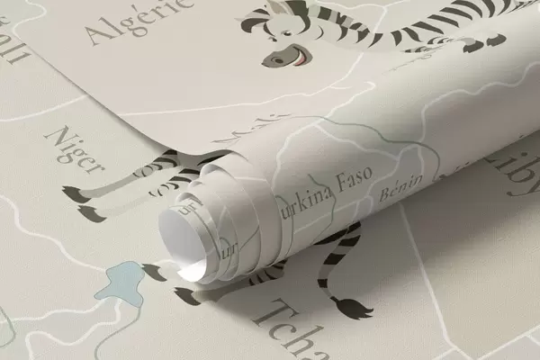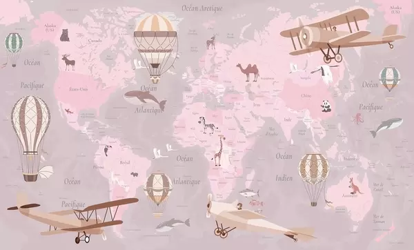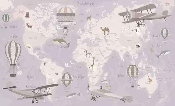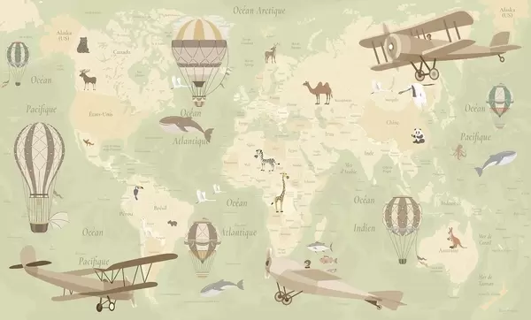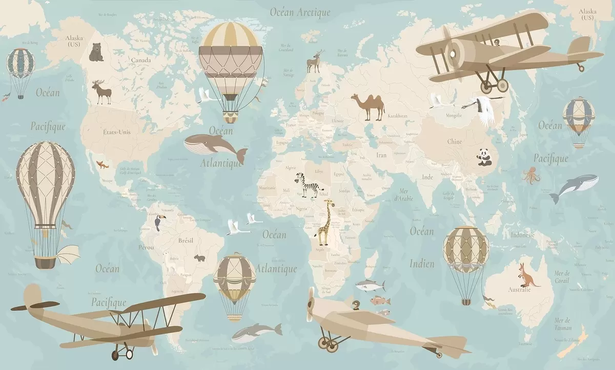 Stenske poslikave Otroški zemljevid sveta z živalmi, letali in toplozračnimi baloni. Francoski jezik. Modra barva. Št. c00003frv1