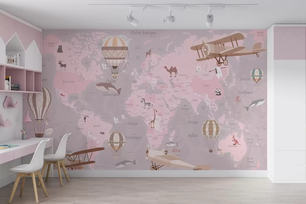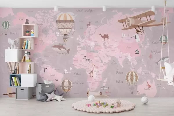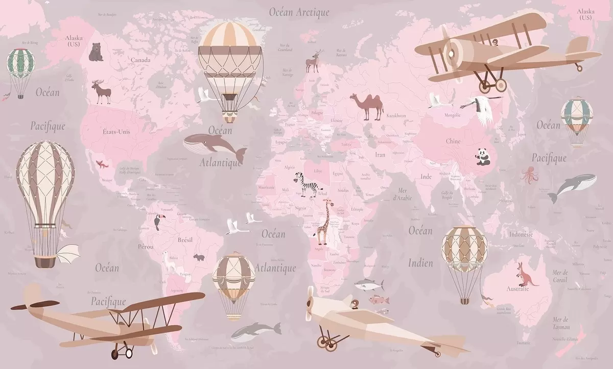 Stenske poslikave Otroški zemljevid sveta z živalmi, letali in toplozračnimi baloni. Francoski jezik. Roza barva. Št. c00003frv3