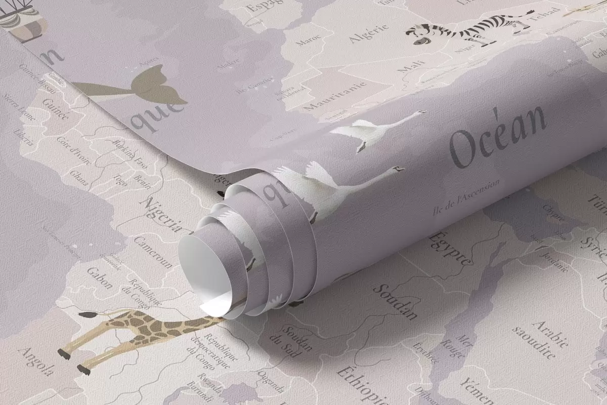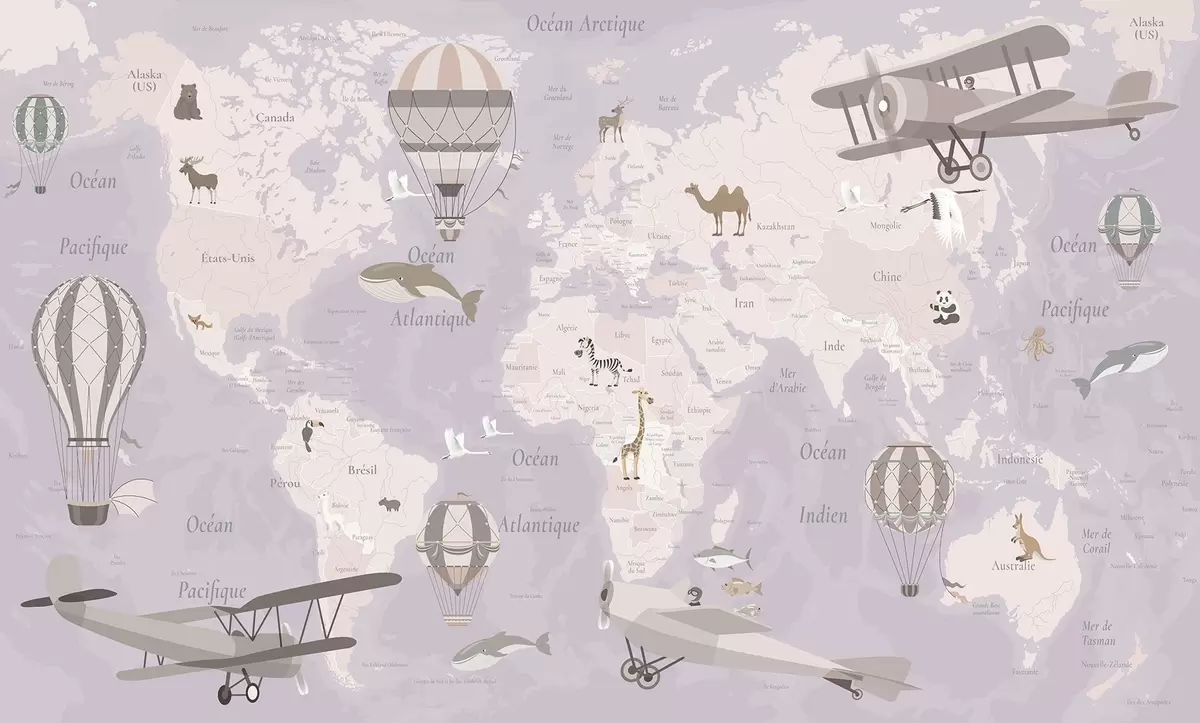 Stenske poslikave Otroški zemljevid sveta z živalmi, letali in toplozračnimi baloni. Francoski jezik. Vijolična barva. Št. c00003frv4