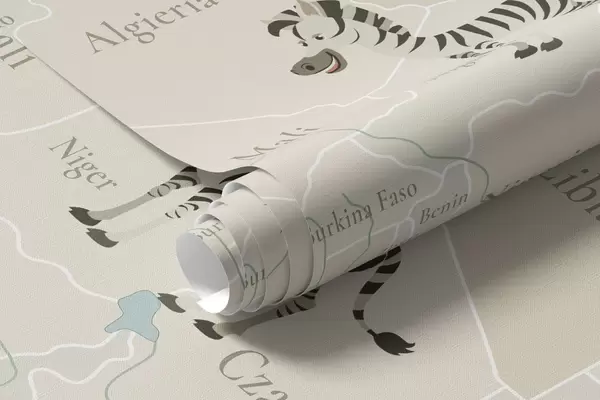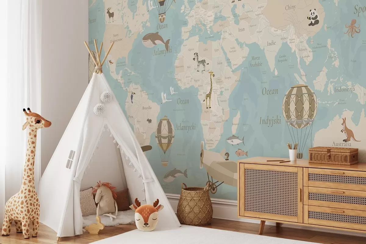 Stenske poslikave Otroški zemljevid sveta z živalmi, letali in toplozračnimi baloni. Poljski jezik. Modra barva. Št. c00003plv1