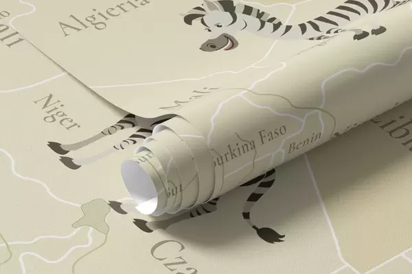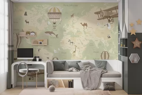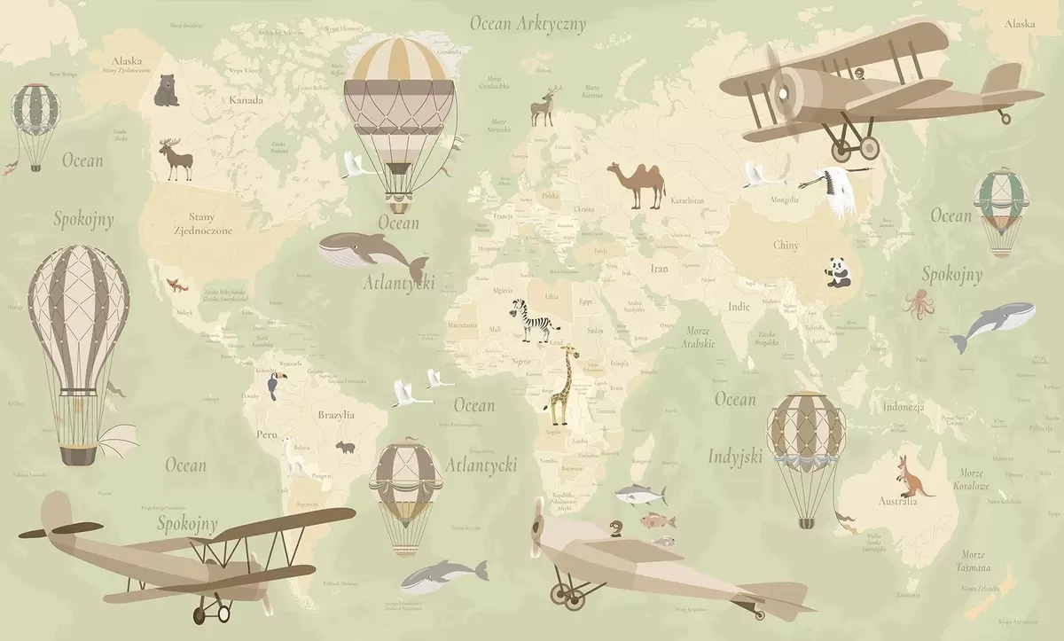 Stenske poslikave Otroški zemljevid sveta z živalmi, letali in toplozračnimi baloni. Poljski jezik. Zelena barva. Št. c00003plv2