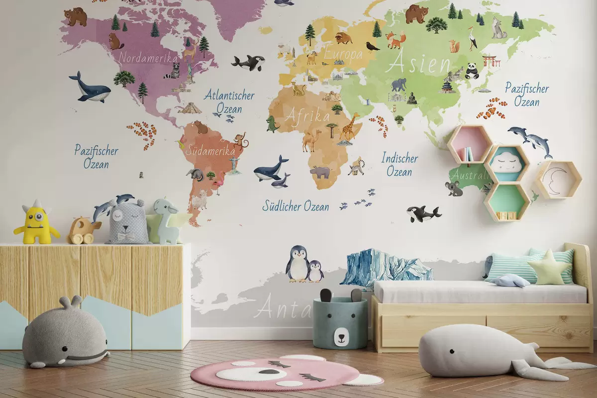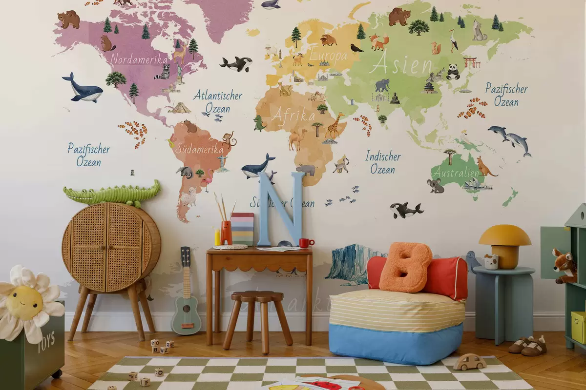 Stenske poslikave Barvna zemljevid v slogu akvarela, na katerem so upodobljene živali, rastline in arhitektura. Napisi v nemščini Št. c00009de
