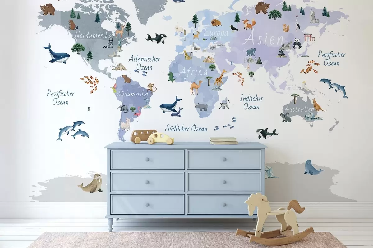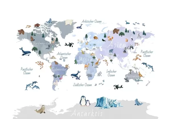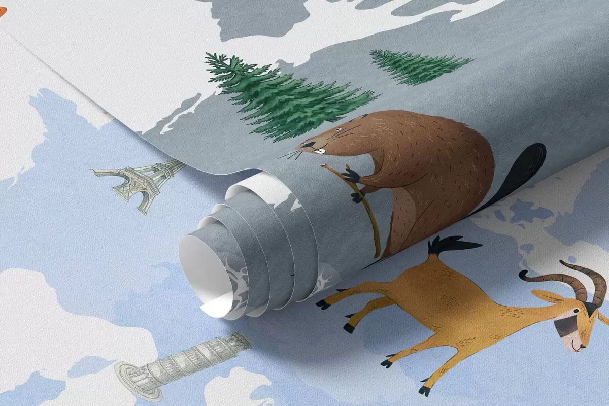 Stenske poslikave Modra zemljevid v slogu akvarela, na katerem so upodobljene živali, rastline in arhitektura. Napisi v nemščini Št. c00009dev1
