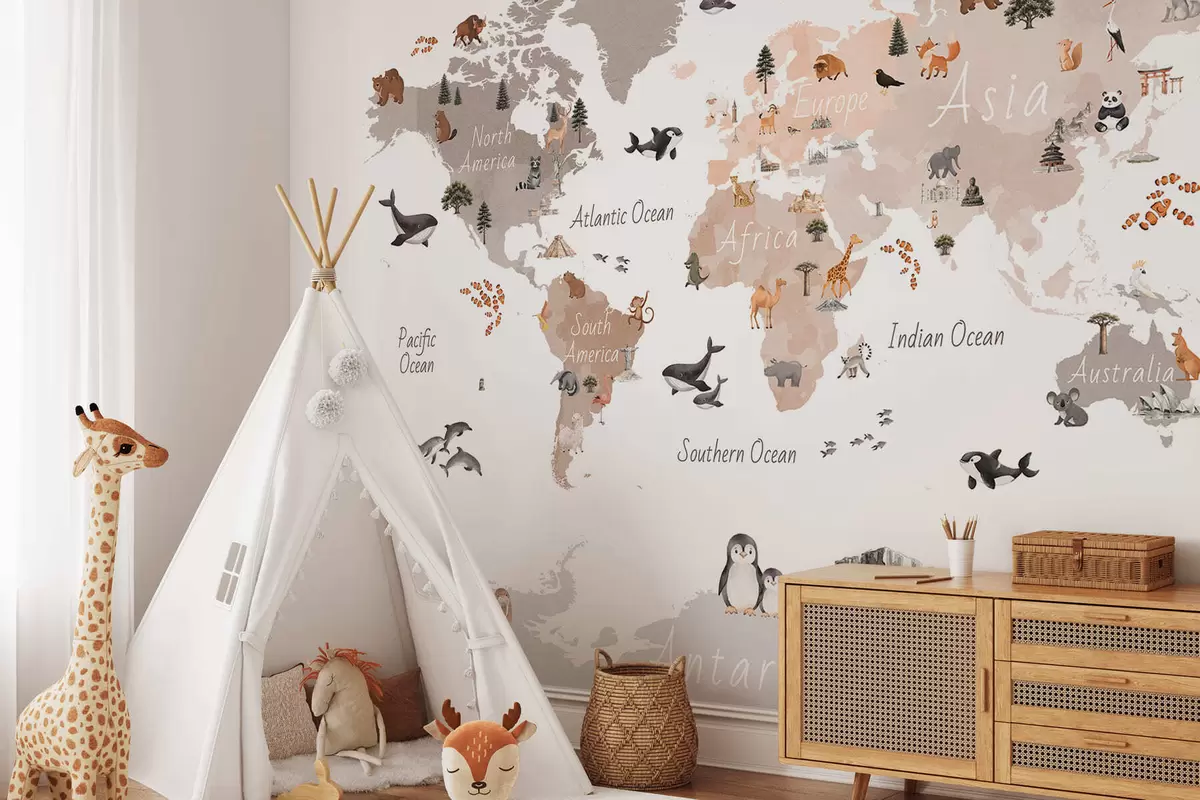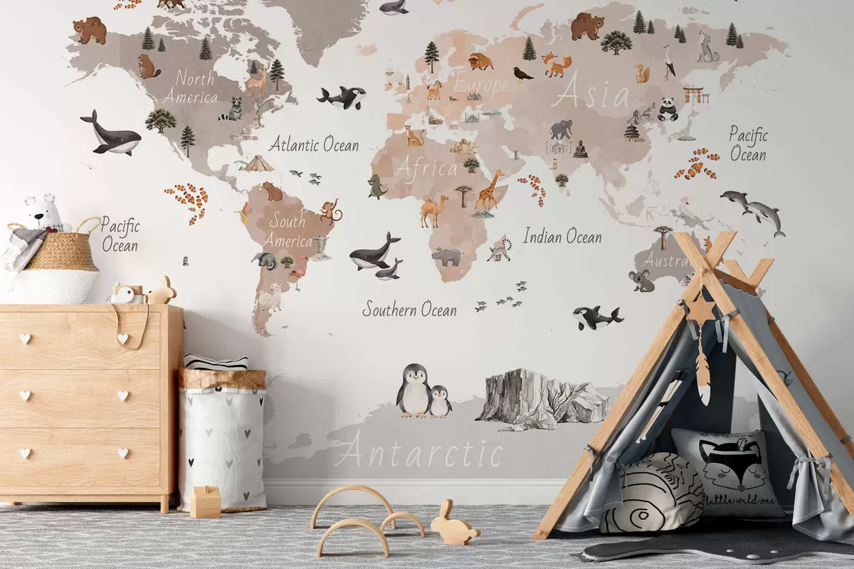 Stenske poslikave Bež zemljevid v slogu akvarela, na katerem so upodobljene živali, rastline in arhitektura. Napisi v angleščini Št. c00009env3