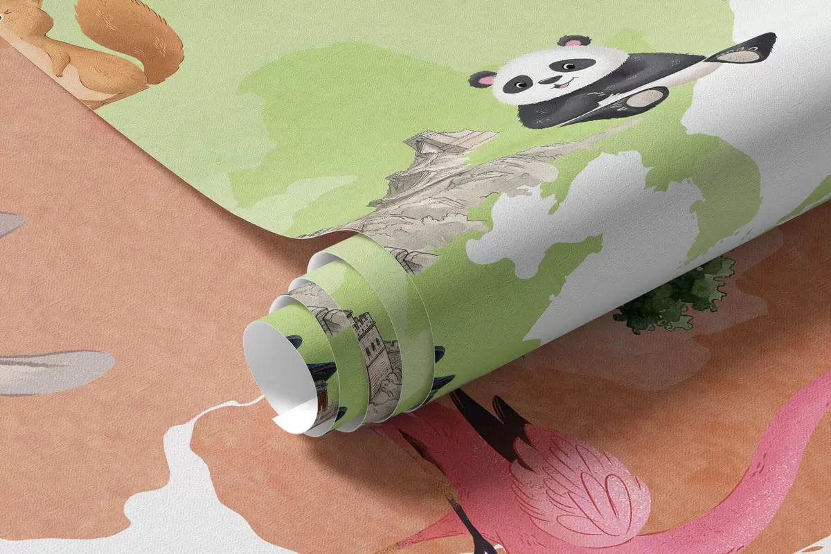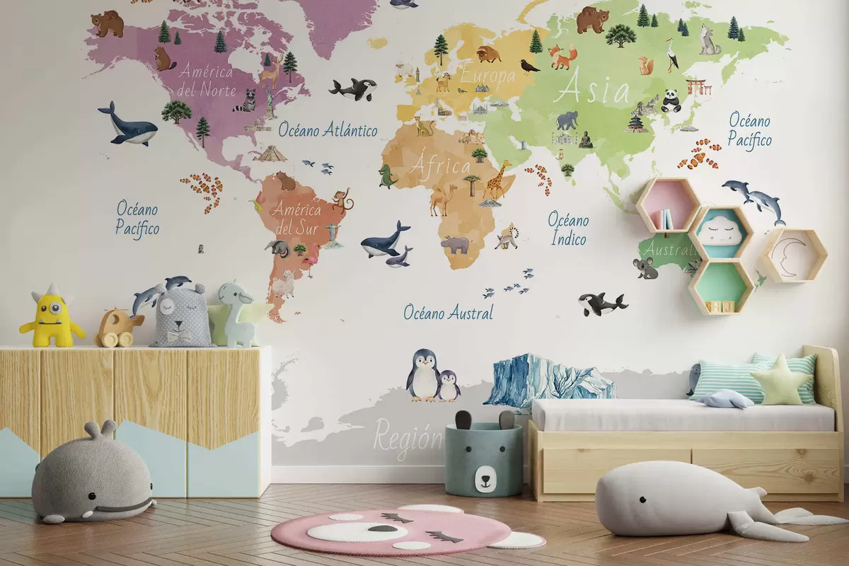 Stenske poslikave Barvna zemljevid v slogu akvarela, na katerem so upodobljene živali, rastline in arhitektura. Napisi v španščini Št. c00009es