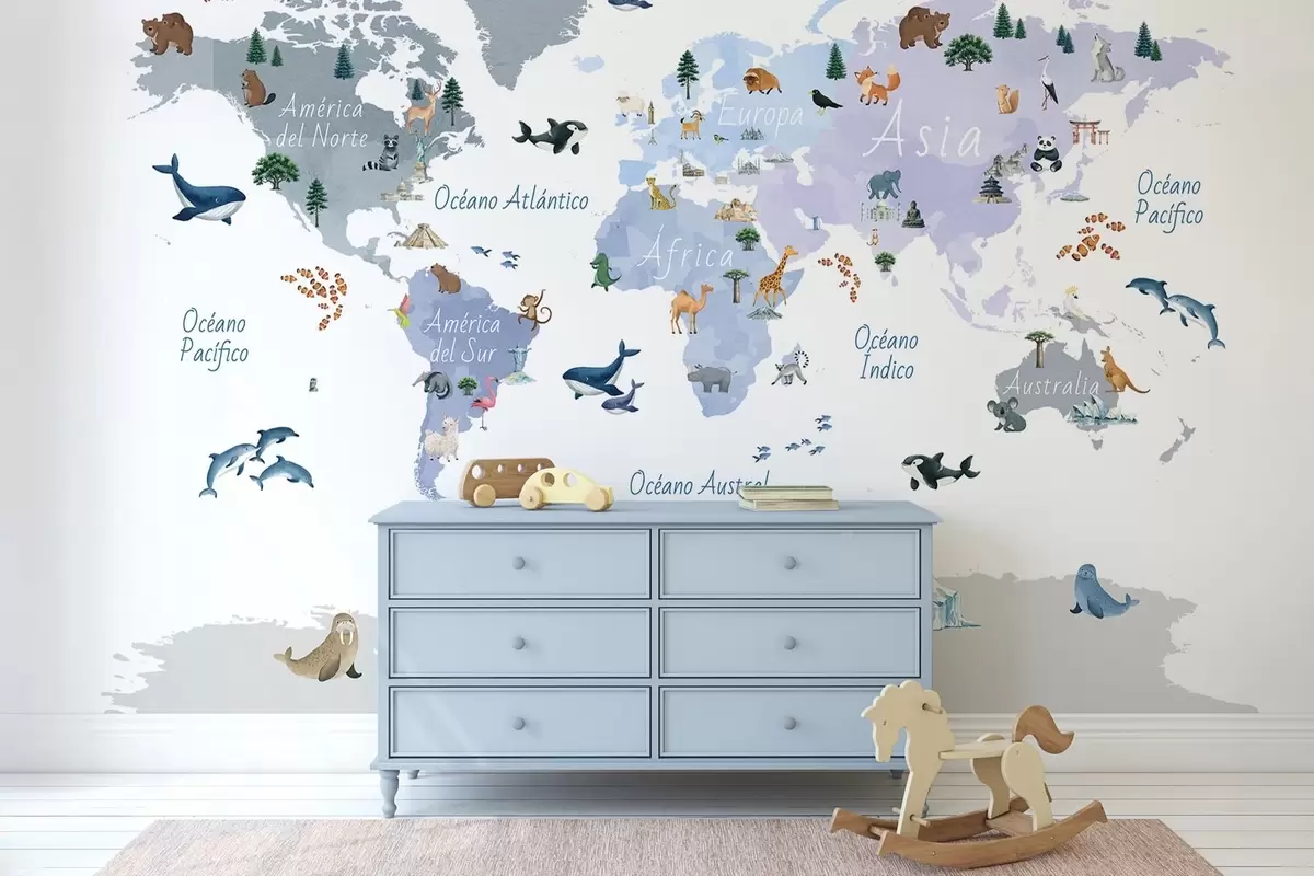 Stenske poslikave Modra zemljevid v slogu akvarela, na katerem so upodobljene živali, rastline in arhitektura. Napisi v španščini Št. c00009esv1