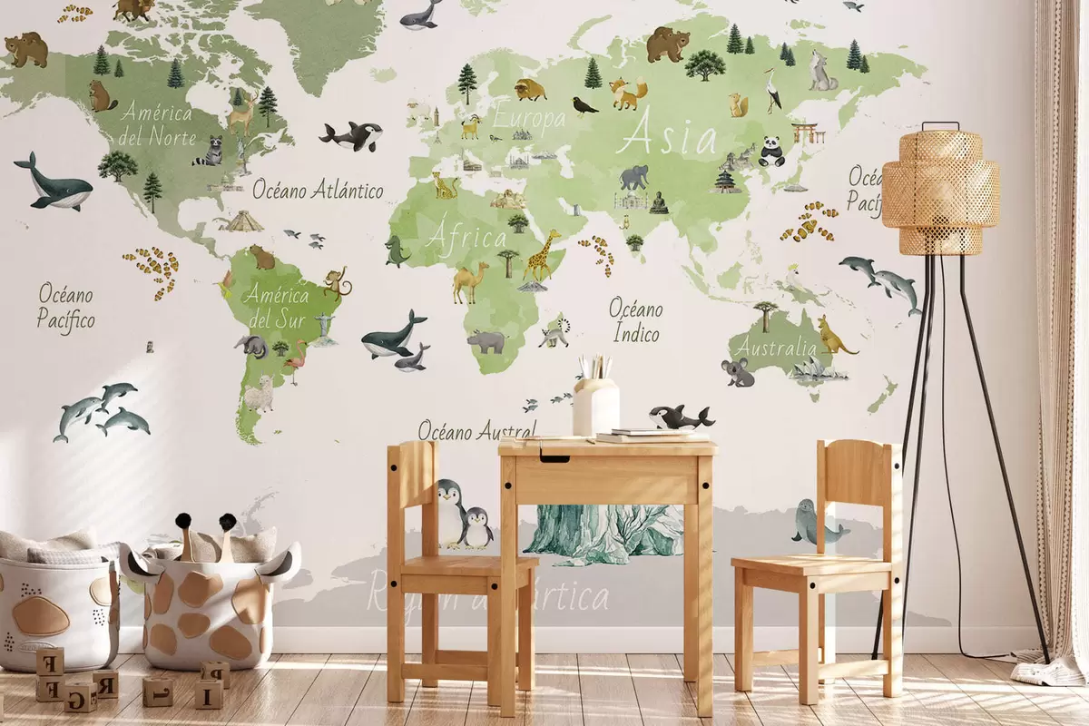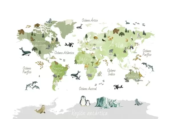 Stenske poslikave Zelena zemljevid v slogu akvarela, na katerem so upodobljene živali, rastline in arhitektura. Napisi v španščini Št. c00009esv2