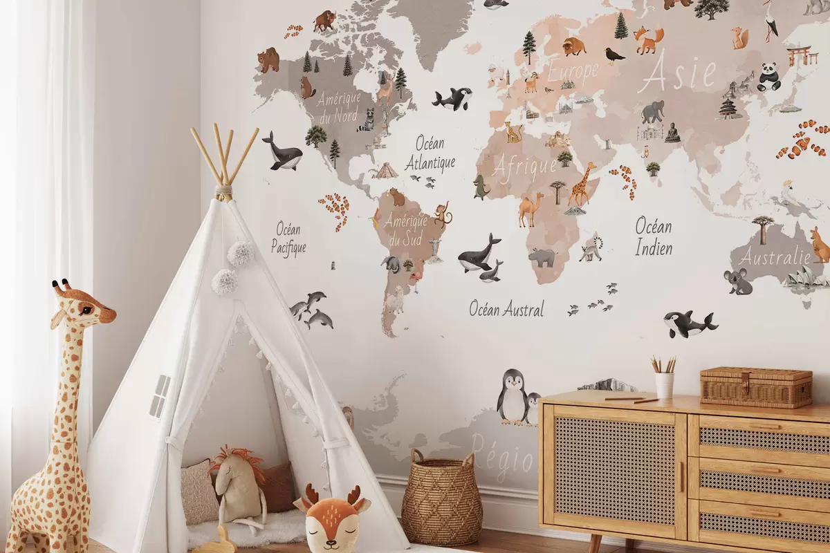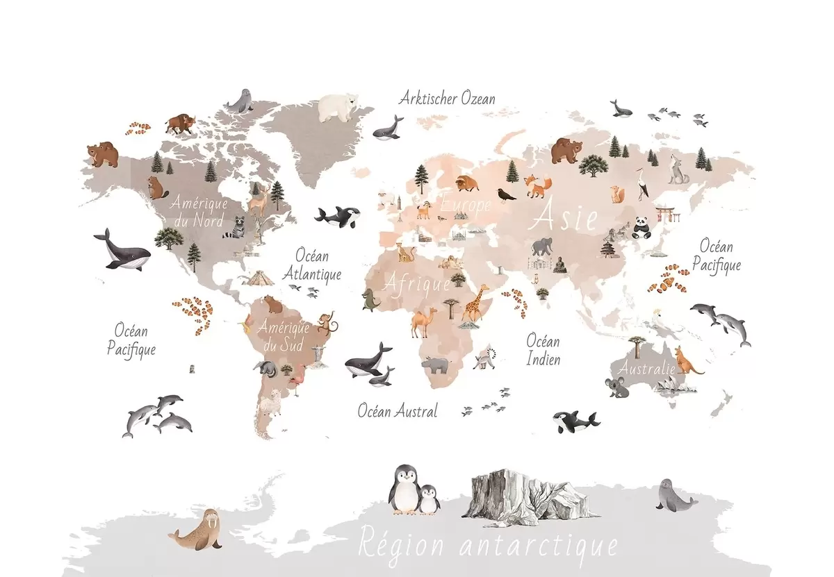 Stenske poslikave Zemljevid v bež barvi v slogu akvarela, na katerem so upodobljene živali, rastline in arhitektura. Napisi so v francoščini. Št. c00009frv3