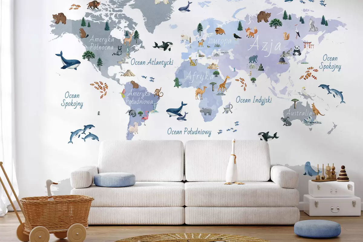 Stenske poslikave Modra zemljevid v slogu akvarela, na katerem so upodobljene živali, rastline in arhitektura. Napisi v poljščini Št. c00009plv1