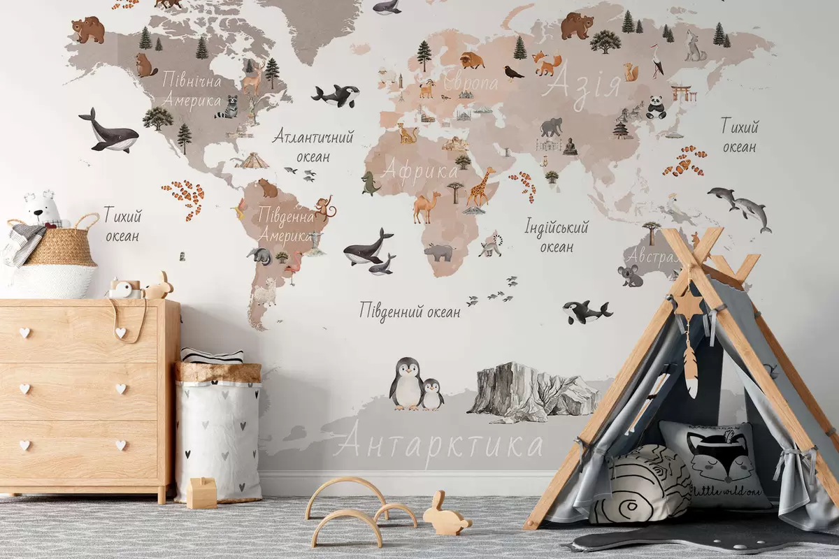 Stenske poslikave Bež zemljevid v slogu akvarela, na katerem so upodobljene živali, rastline in arhitektura. Napisi v ukrajinščini Št. c00009ukv3