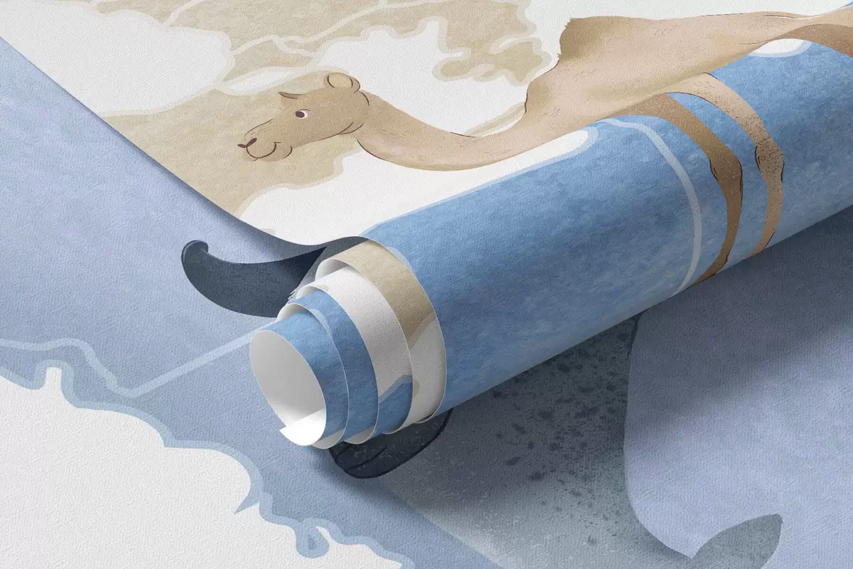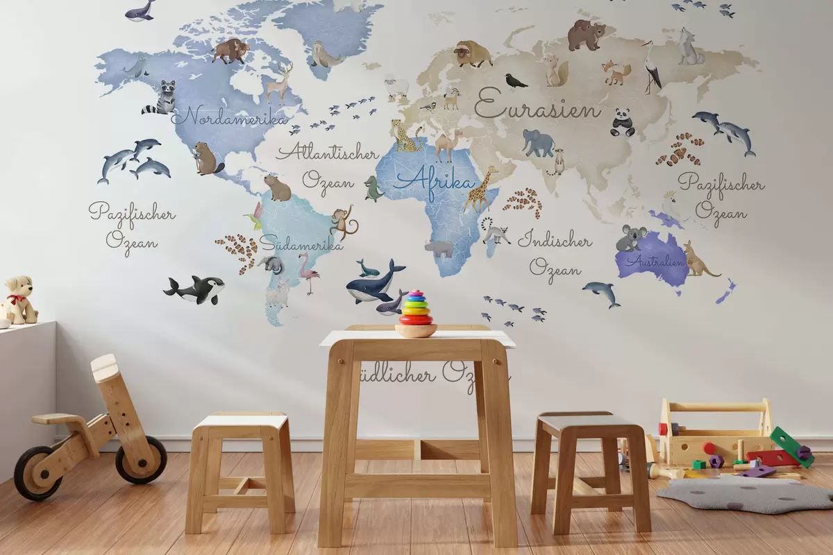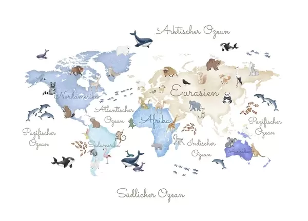 Stenske poslikave Modra zemljevid v slogu akvarela z živalmi. Napisi v nemščini Št. c00012dev1