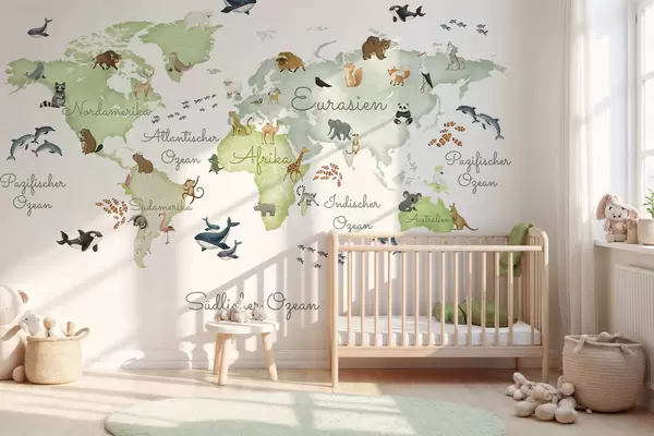 Stenske poslikave Zelena zemljevid v slogu akvarela z živalmi. Napisi v nemščini Št. c00012dev2