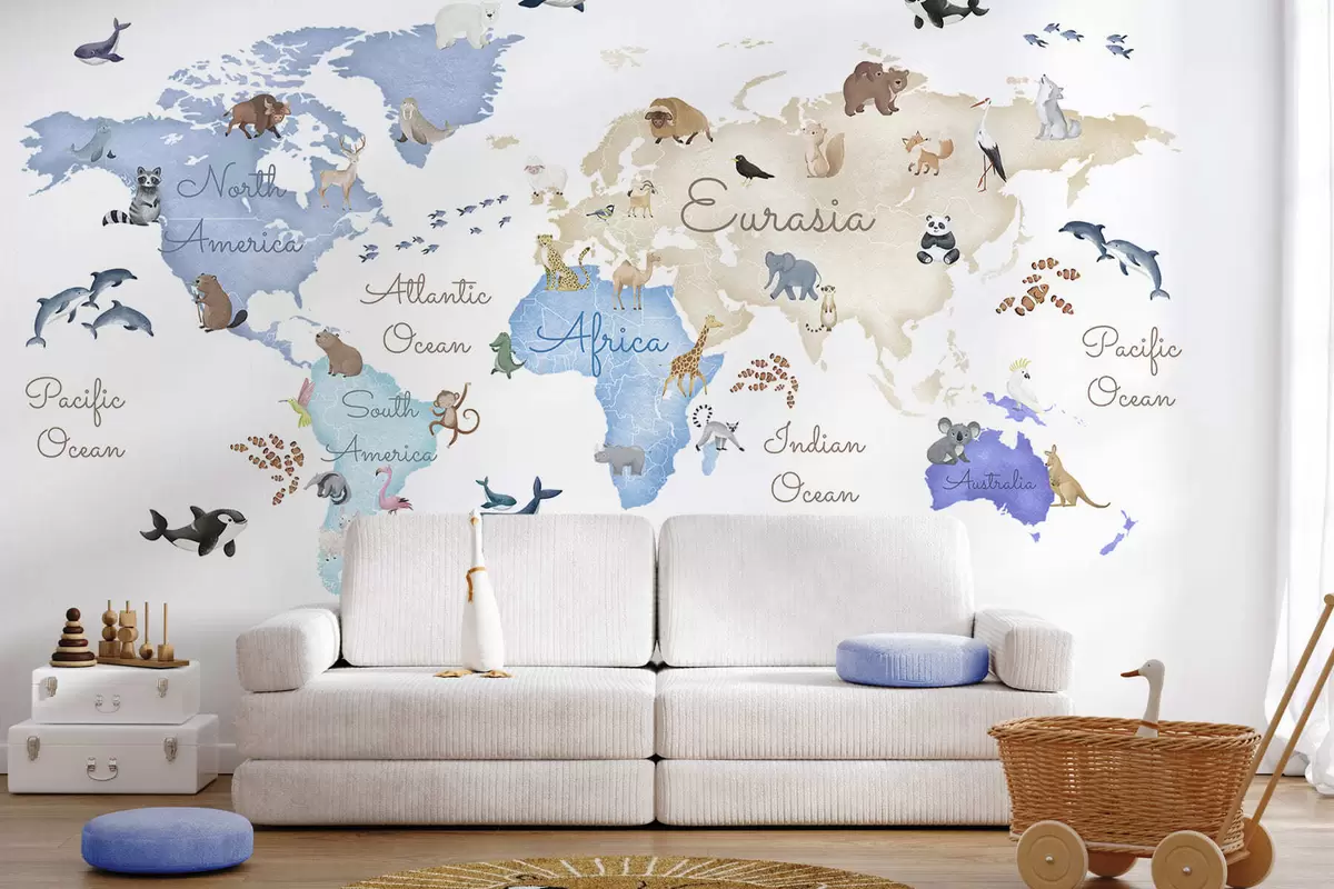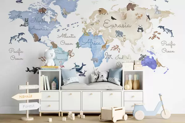 Stenske poslikave Modra zemljevid v slogu akvarela z živalmi. Napisi v angleščini Št. c00012env1