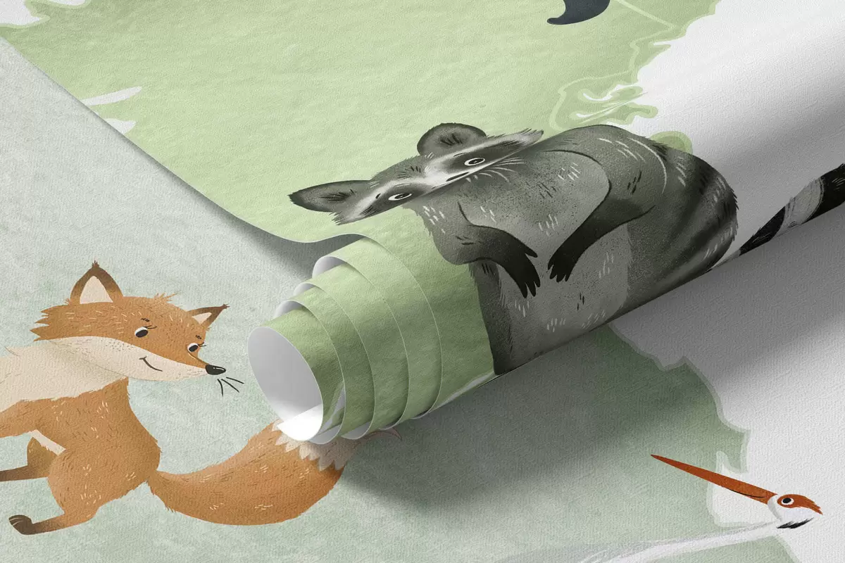Stenske poslikave Zelena zemljevid v slogu akvarela z živalmi. Napisi v angleščini Št. c00012env2