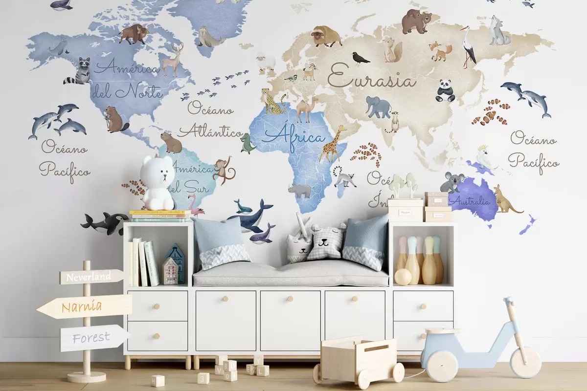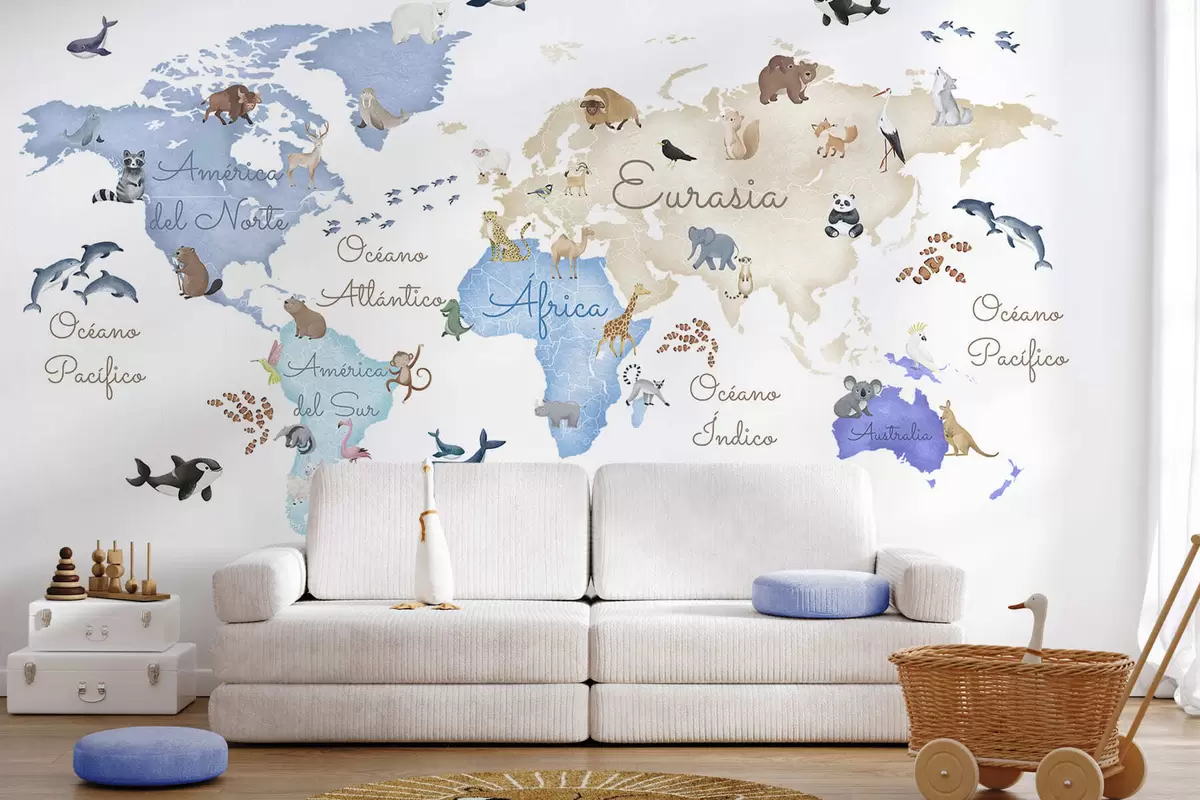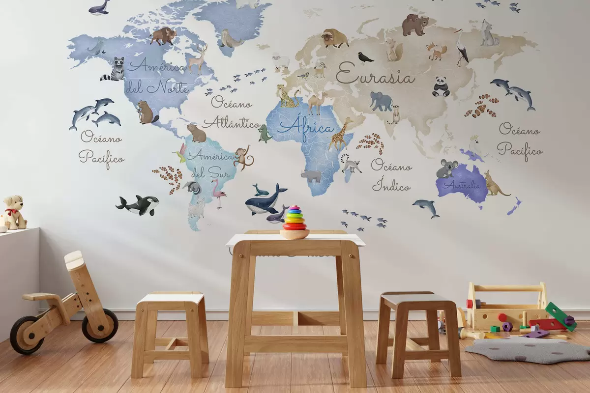 Stenske poslikave Modra zemljevid v slogu akvarela z živalmi. Napisi v španščini Št. c00012esv1