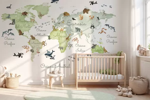 Stenske poslikave Zelena zemljevid v slogu akvarela z živalmi. Napisi v španščini Št. c00012esv2