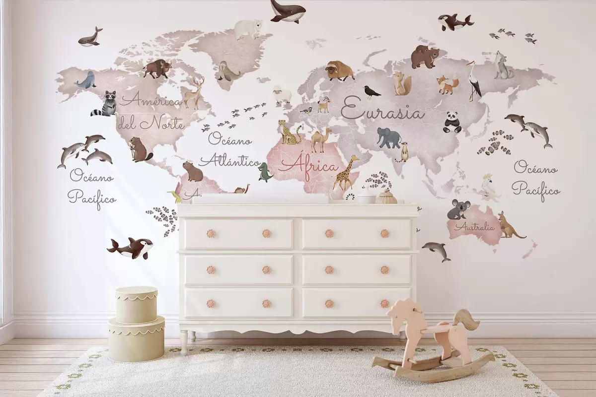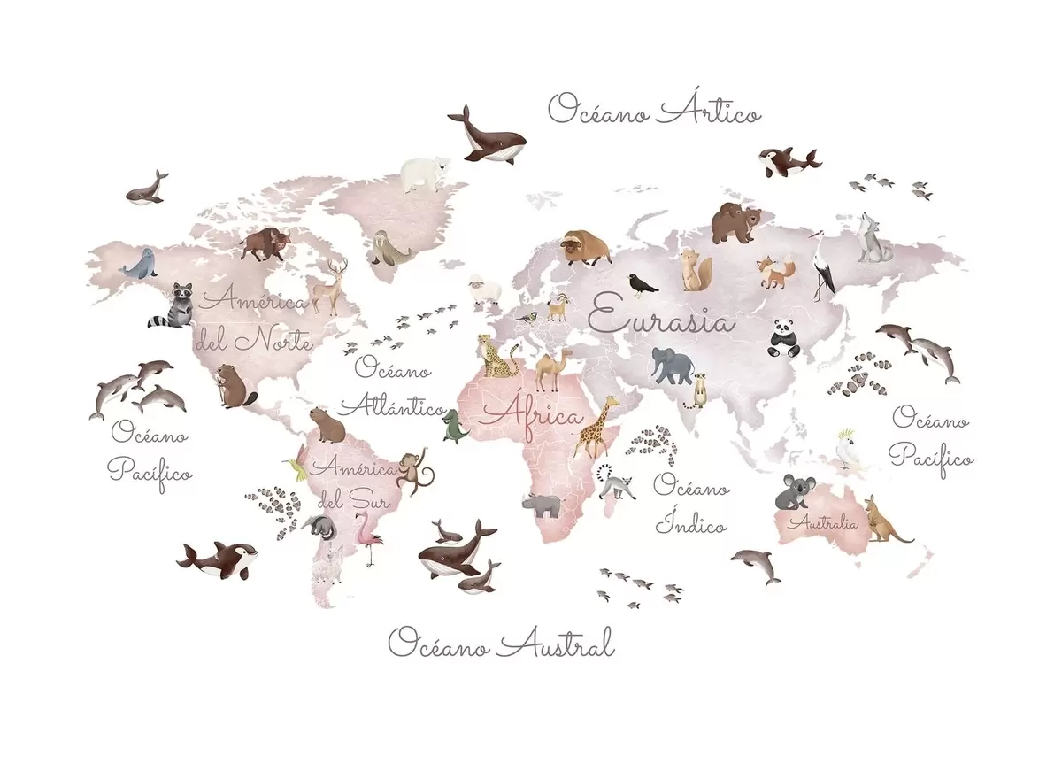 Stenske poslikave Bež zemljevid v slogu akvarela z upodobljenimi živalmi. Napisi v španščini Št. c00012esv3