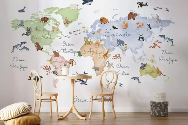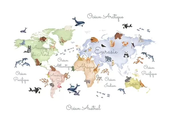 Stenske poslikave Barvna zemljevid v slogu akvarela z živalmi. Napisi v francoščini Št. c00012fr