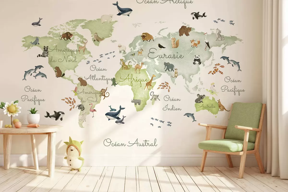 Stenske poslikave Zelena zemljevid v slogu akvarela z živalmi. Napisi v francoščini Št. c00012frv2