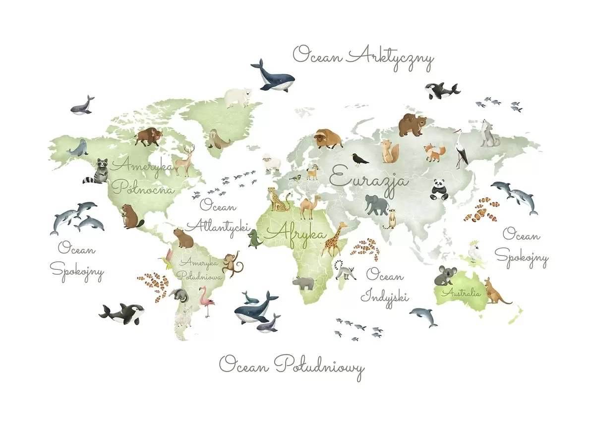 Stenske poslikave Zelena zemljevid v slogu akvarela z živalmi. Napisi v poljščini Št. c00012plv2