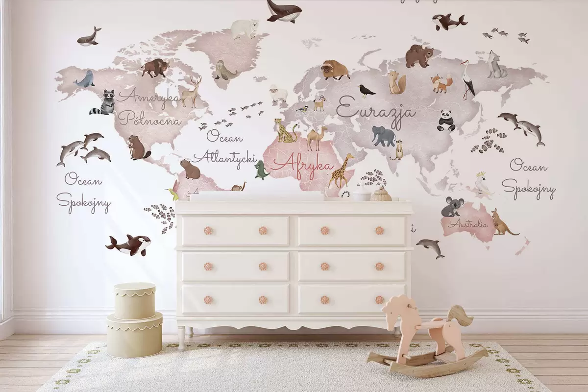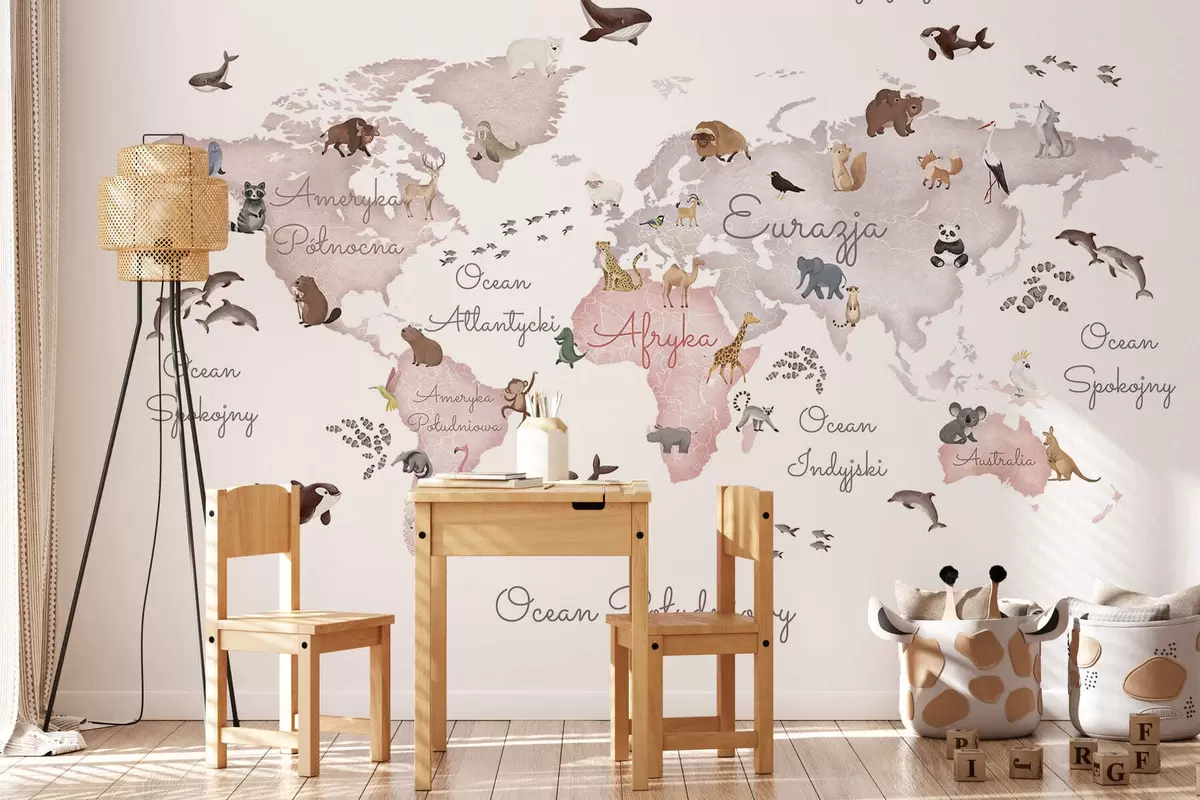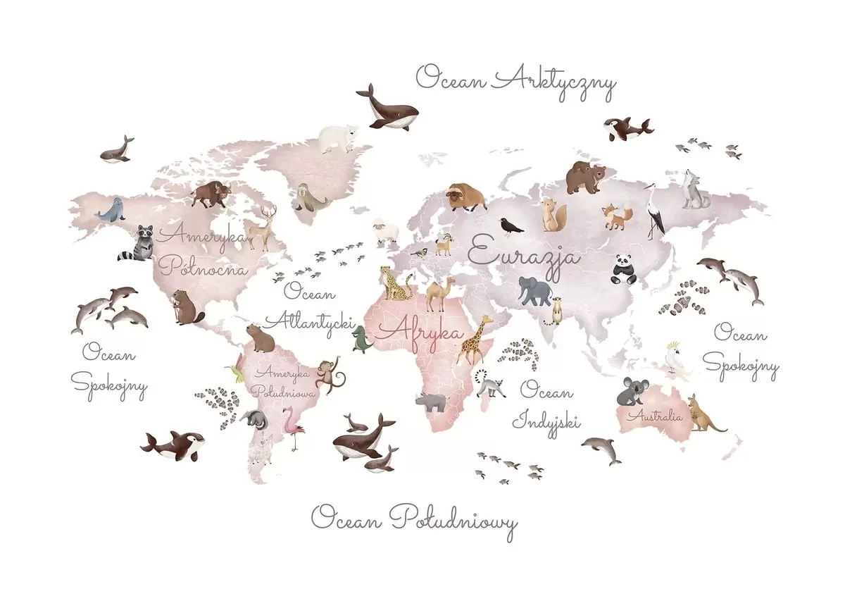 Stenske poslikave Bež zemljevid v slogu akvarela z živalmi. Napisi v poljščini Št. c00012plv3