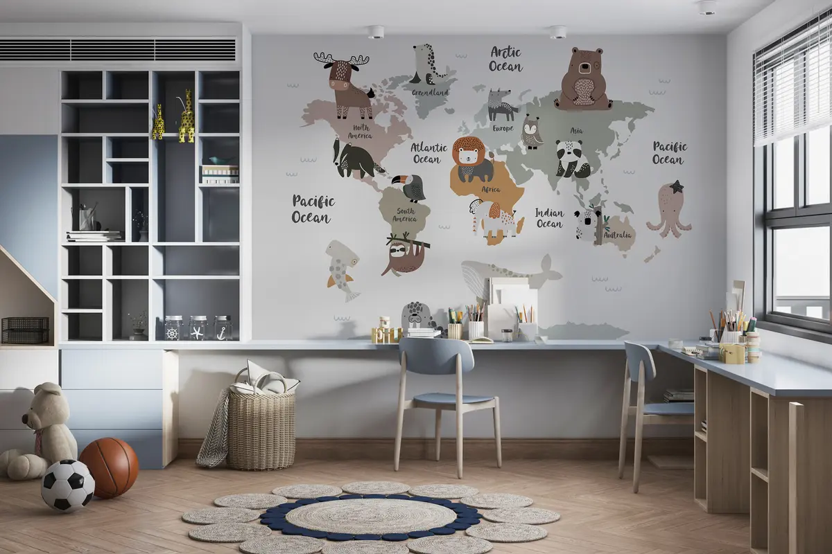 Stenske poslikave Zemljevid sveta za otroke z ljubkimi živalmi Št. u99161
