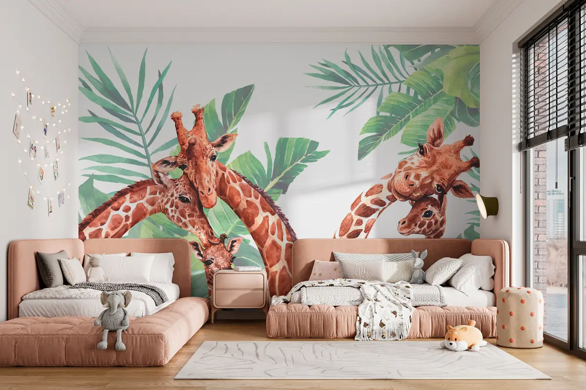 Stenske poslikave Risana družina žiraf in palmovi listi na belem ozadju Št. w00140v3