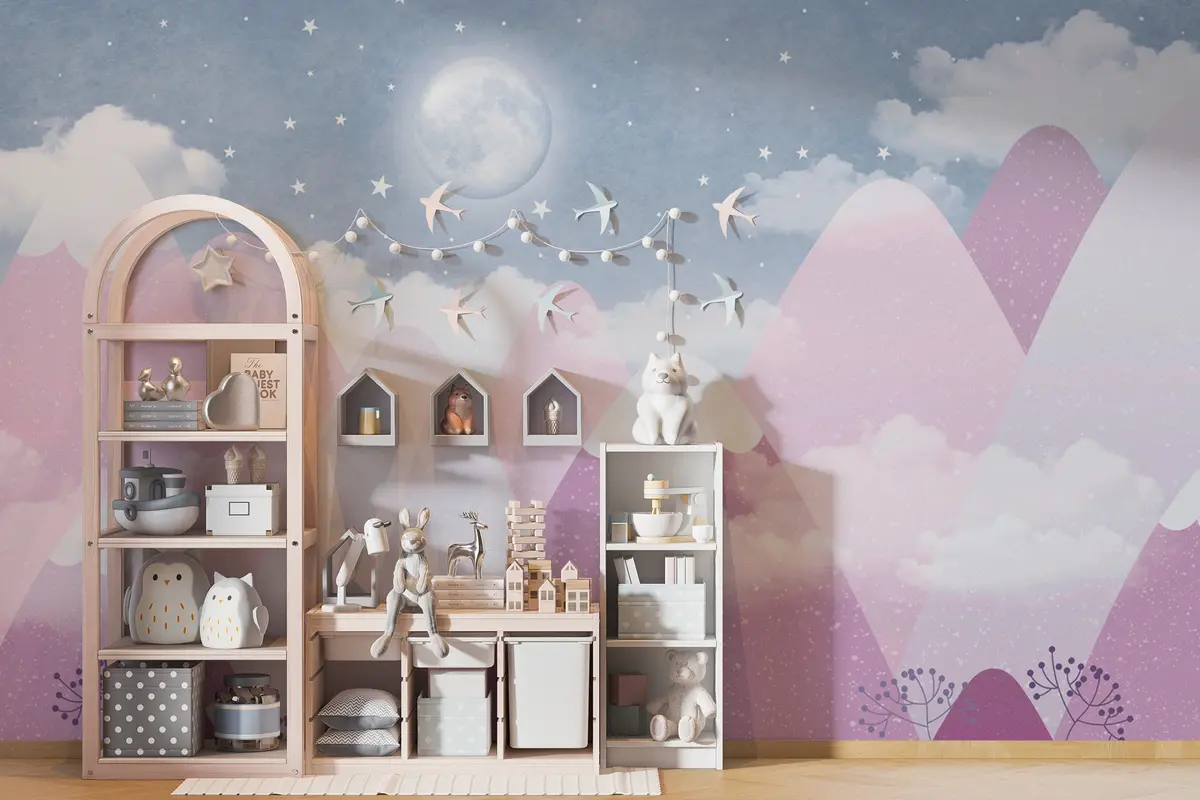 Stenske poslikave Luna nad zasneženimi gorami otroška ilustracija v modri barvi Št. w00374v1
